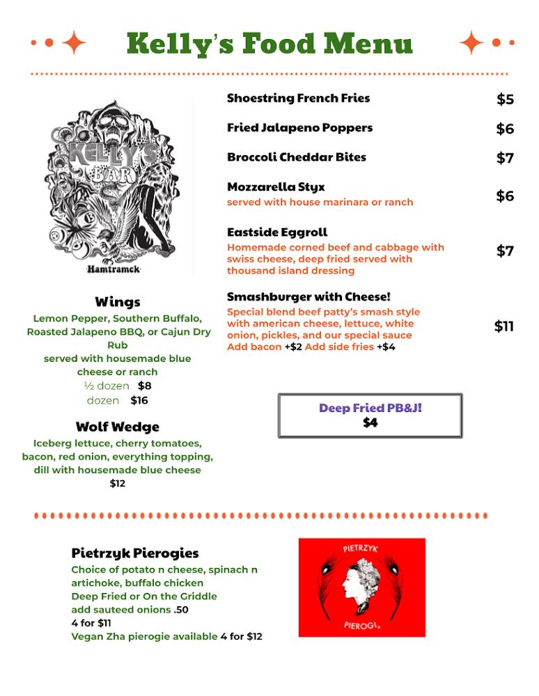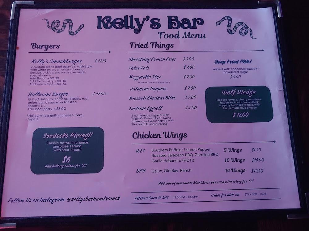 Welcome to Kelly's Bar Hamtramck, the oldest bar in town, conveniently located across from the Kowalski sausage factory. Embrace the dive bar atmosphere where everyone feels at home while enjoying our nightly drink specials. Relax in our spacious backyard with ample seating, perfect for a sunny afternoon or evening gathering. Indulge in delicious bar snacks, excellent cocktails, and a wide selection of beers. With entertainment options like karaoke, game nights, and live shows, fun is always on the menu. Join us for a casual dining experience, and make lasting memories in a vibrant community hub.